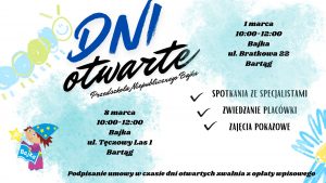 Dni otwarte Bajki! Feb 13, 2025 Szanowni Państwo, zapraszamy na dni otwarte naszej placówki, 1 marca od 10:00 do 12:00 przy ulicy Bratkowej 22 w Bartągu.