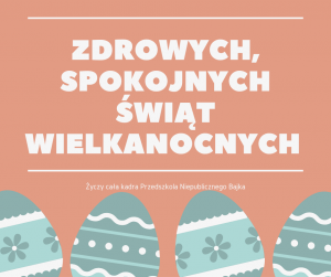 Zdrowych, radosnych Świąt Wielkiej Nocy, suto zastawionych stołów, dużo wody w poniedziałek, bogatego zająca i jak najmilszych spotkań w gronie przyjaciół i rodziny życzy Dyrektor , kadra pedagogiczna oraz pozostali pracownicy Przedszkola Niepublicznego Bajka